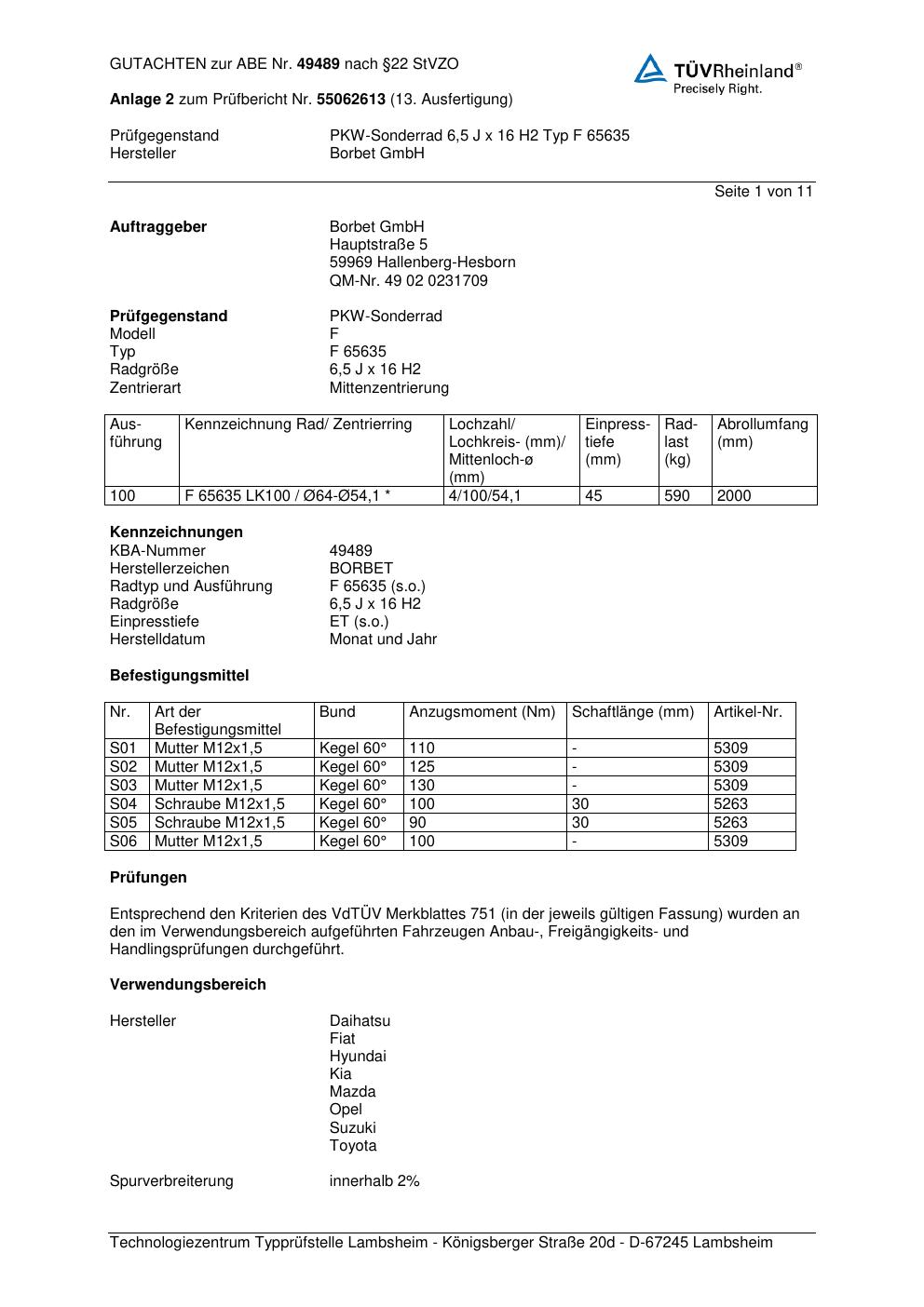 Dieses Gutachten (abe) bezieht sich auf die Alufelge Borbet F 65 635 in der Ausführung 6.5Jx16 ET 0, Mittenloch 0 mm (KBA 49489). Im PDF findest du typischerweise zulässige Reifengrößen, Auflagen/Anbauhinweise und – je nach Dokument – Hinweise zur Eintragung.
