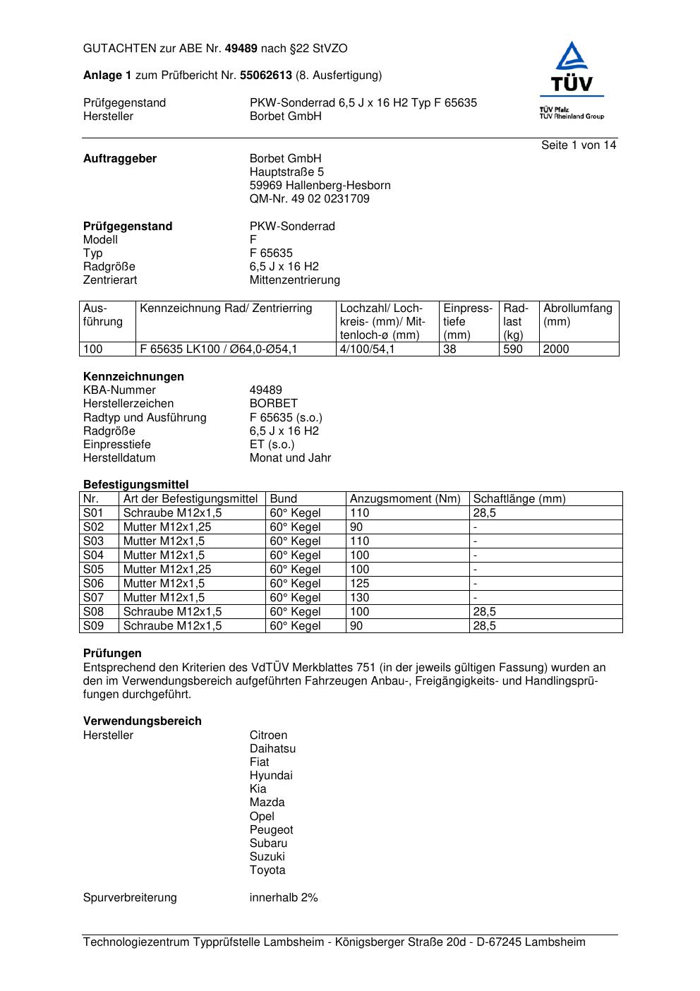 Dieses Gutachten (abe) bezieht sich auf die Alufelge Borbet F 65 635 in der Ausführung 6.5Jx16 ET 0, Mittenloch 0 mm (KBA 49489). Im PDF findest du typischerweise zulässige Reifengrößen, Auflagen/Anbauhinweise und – je nach Dokument – Hinweise zur Eintragung.