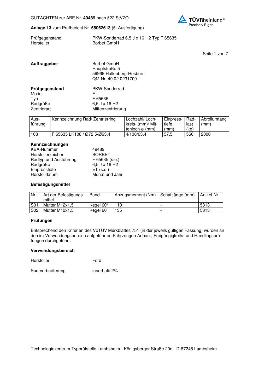 Dieses Gutachten (abe) bezieht sich auf die Alufelge Borbet F 65 635 in der Ausführung 6.5Jx16 ET 0, Mittenloch 0 mm (KBA 49489). Im PDF findest du typischerweise zulässige Reifengrößen, Auflagen/Anbauhinweise und – je nach Dokument – Hinweise zur Eintragung.