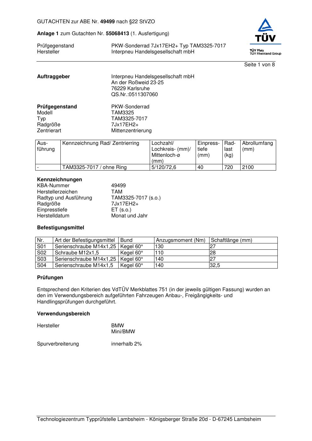 Dieses Gutachten (abe) bezieht sich auf die Alufelge Platin TAM3325- 7017 in der Ausführung ET 0, Mittenloch 0 mm (KBA 49499). Im PDF findest du typischerweise zulässige Reifengrößen, Auflagen/Anbauhinweise und – je nach Dokument – Hinweise zur Eintragung.