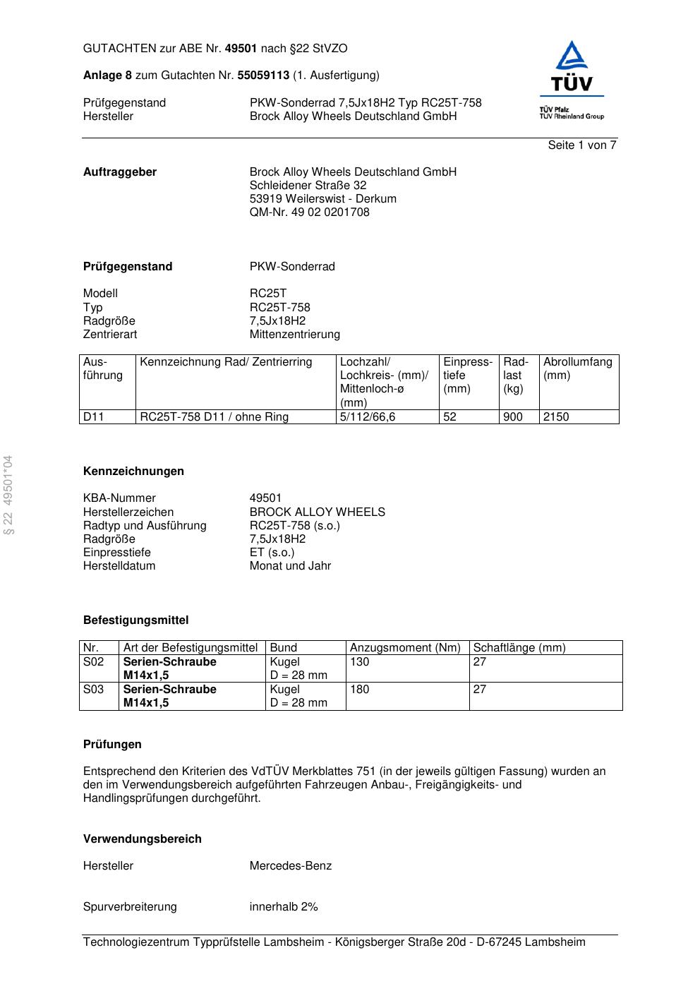 Dieses Gutachten (abe) bezieht sich auf die Alufelge Brock RC25T-75 8 in der Ausführung 7.5Jx18 ET 0, Mittenloch 0 mm (KBA 49501). Im PDF findest du typischerweise zulässige Reifengrößen, Auflagen/Anbauhinweise und – je nach Dokument – Hinweise zur Eintragung.
