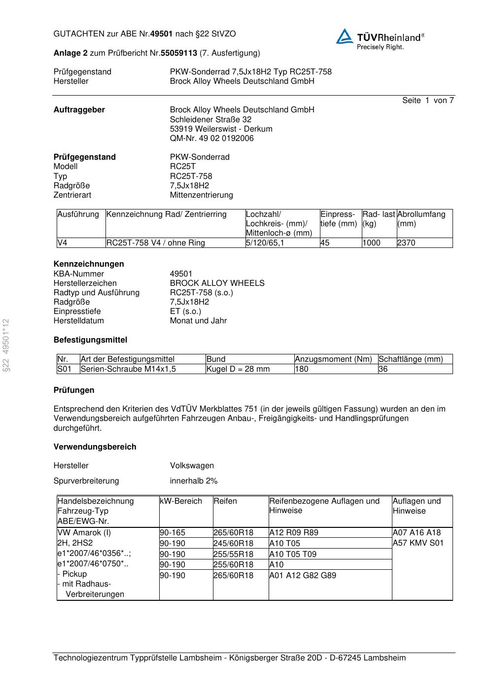 Dieses Gutachten (abe) bezieht sich auf die Alufelge Brock RC25T-75 8 in der Ausführung 7.5Jx18 ET 0, Mittenloch 0 mm (KBA 49501). Im PDF findest du typischerweise zulässige Reifengrößen, Auflagen/Anbauhinweise und – je nach Dokument – Hinweise zur Eintragung.