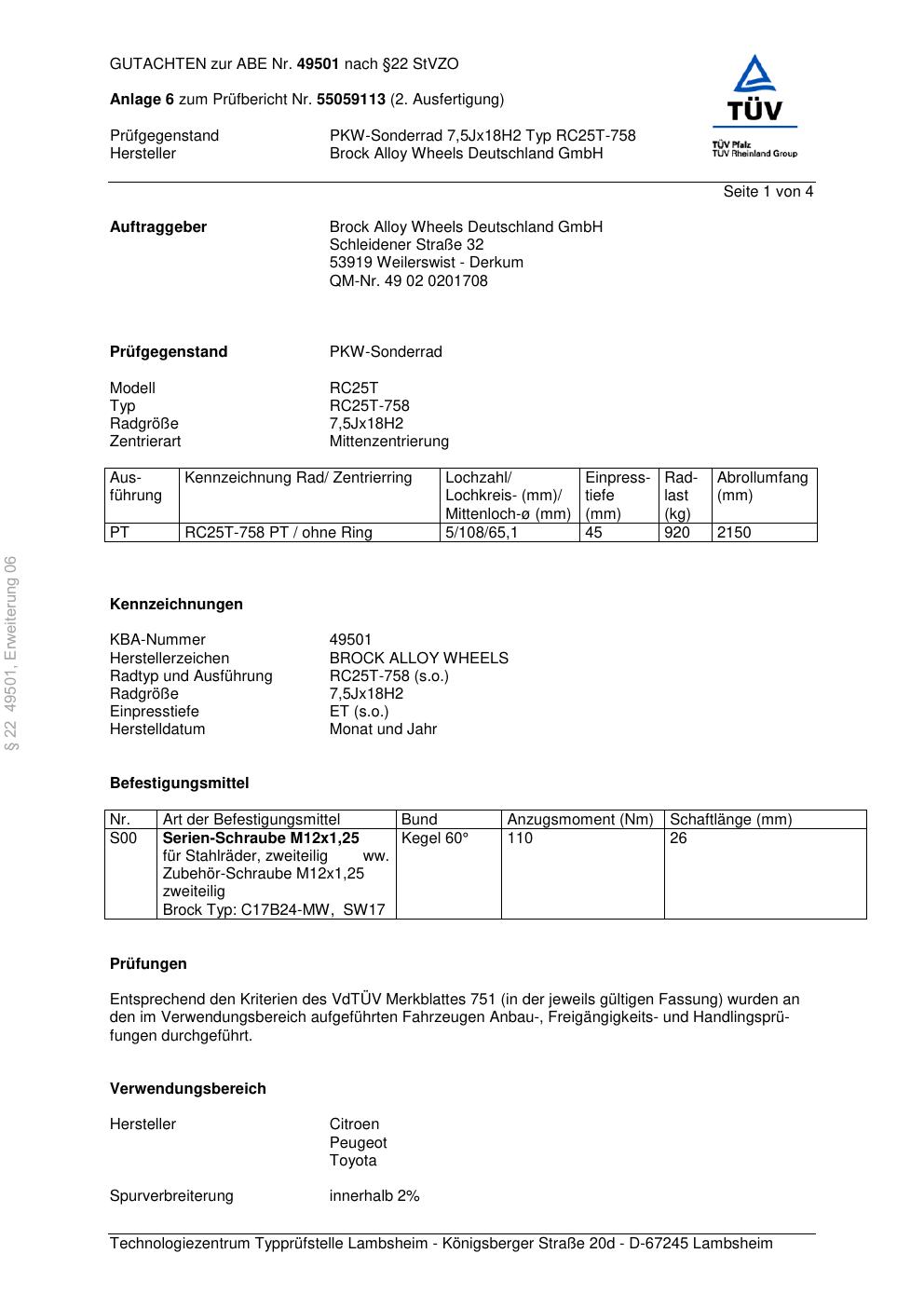 Dieses Gutachten (abe) bezieht sich auf die Alufelge Brock RC25T-75 8 in der Ausführung 7.5Jx18 ET 0, Mittenloch 0 mm (KBA 49501). Im PDF findest du typischerweise zulässige Reifengrößen, Auflagen/Anbauhinweise und – je nach Dokument – Hinweise zur Eintragung.