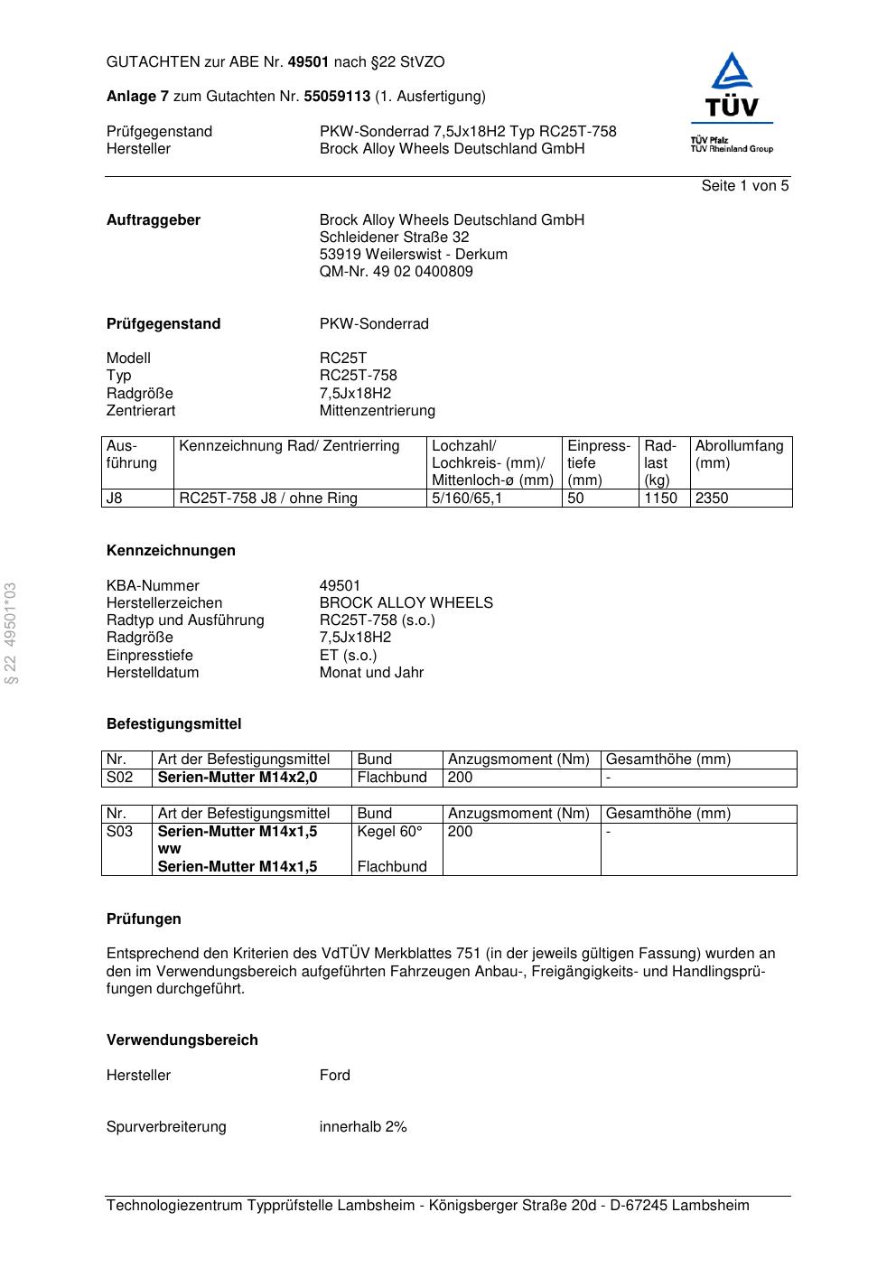 Dieses Gutachten (abe) bezieht sich auf die Alufelge Brock RC25T-75 8 in der Ausführung 7.5Jx18 ET 0, Mittenloch 0 mm (KBA 49501). Im PDF findest du typischerweise zulässige Reifengrößen, Auflagen/Anbauhinweise und – je nach Dokument – Hinweise zur Eintragung.