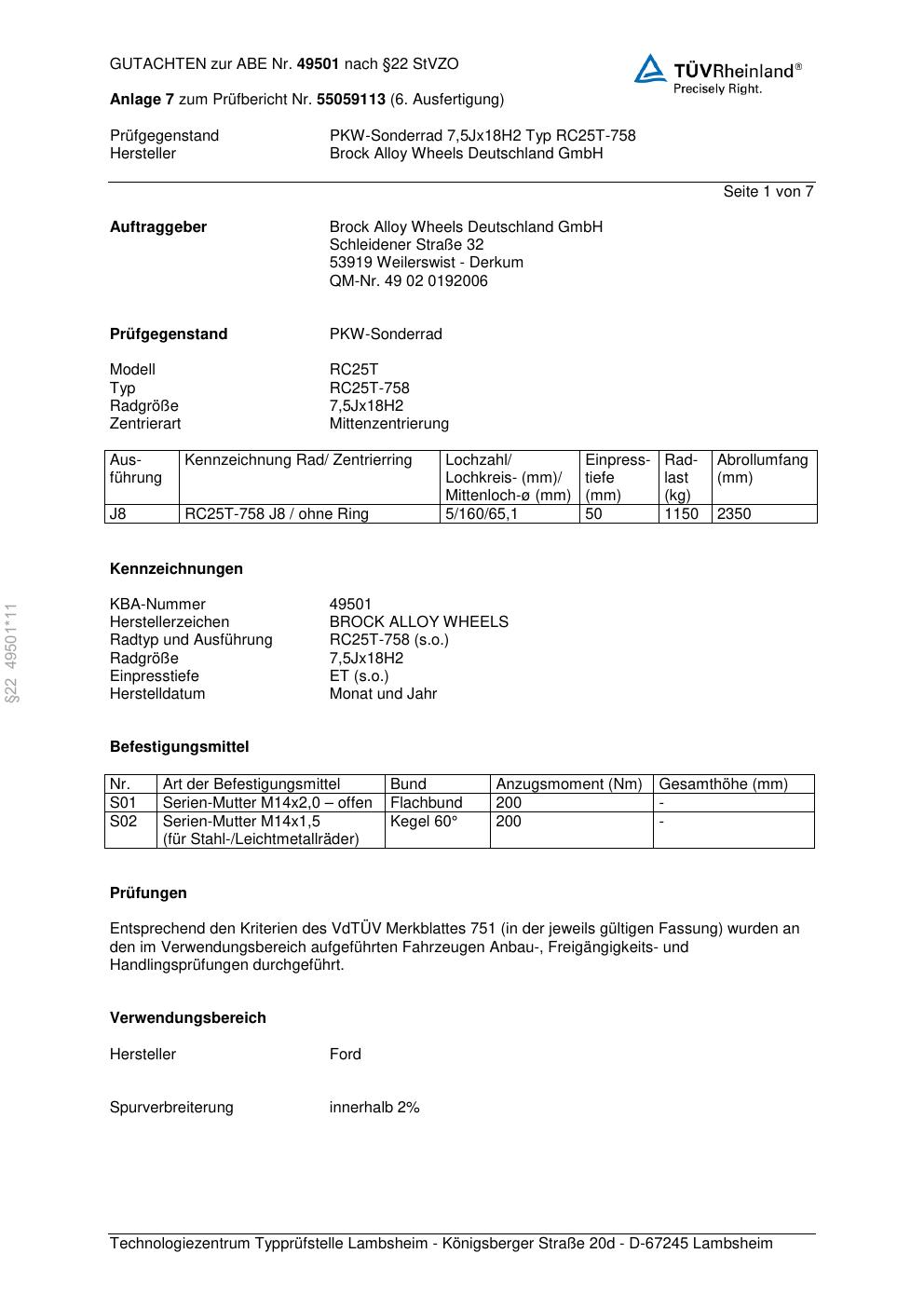 Dieses Gutachten (abe) bezieht sich auf die Alufelge Brock RC25T-75 8 in der Ausführung 7.5Jx18 ET 0, Mittenloch 0 mm (KBA 49501). Im PDF findest du typischerweise zulässige Reifengrößen, Auflagen/Anbauhinweise und – je nach Dokument – Hinweise zur Eintragung.