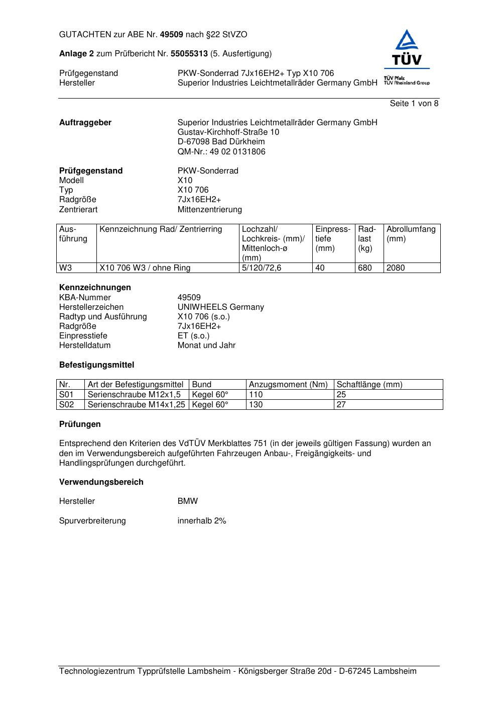Dieses Gutachten (abe) bezieht sich auf die Alufelge Superior X10 706 in der Ausführung ET 0, Mittenloch 0 mm (KBA 49509). Im PDF findest du typischerweise zulässige Reifengrößen, Auflagen/Anbauhinweise und – je nach Dokument – Hinweise zur Eintragung.