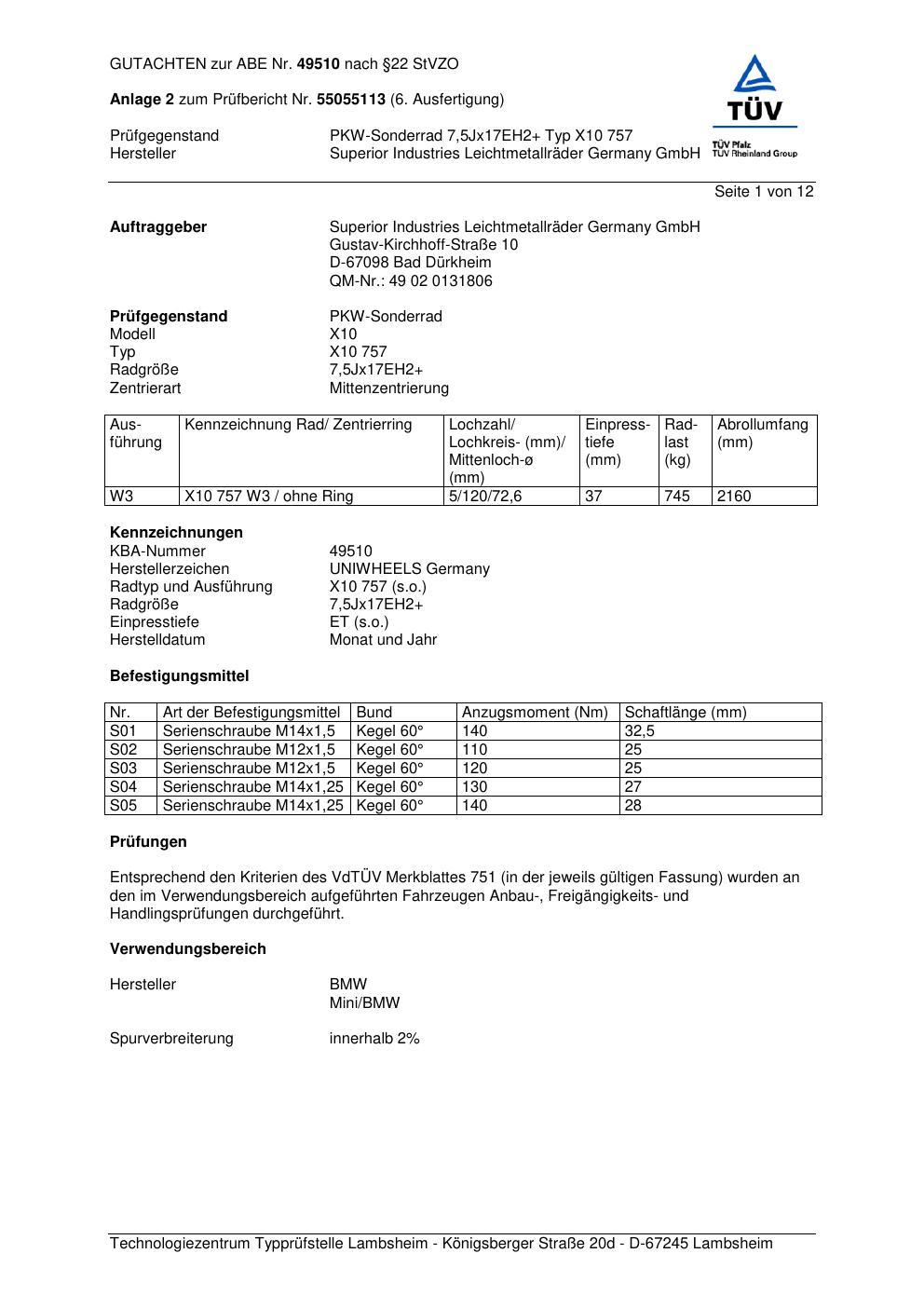 Dieses Gutachten (abe) bezieht sich auf die Alufelge Superior X10 75 7 in der Ausführung ET 0, Mittenloch 0 mm (KBA 49510). Im PDF findest du typischerweise zulässige Reifengrößen, Auflagen/Anbauhinweise und – je nach Dokument – Hinweise zur Eintragung.
