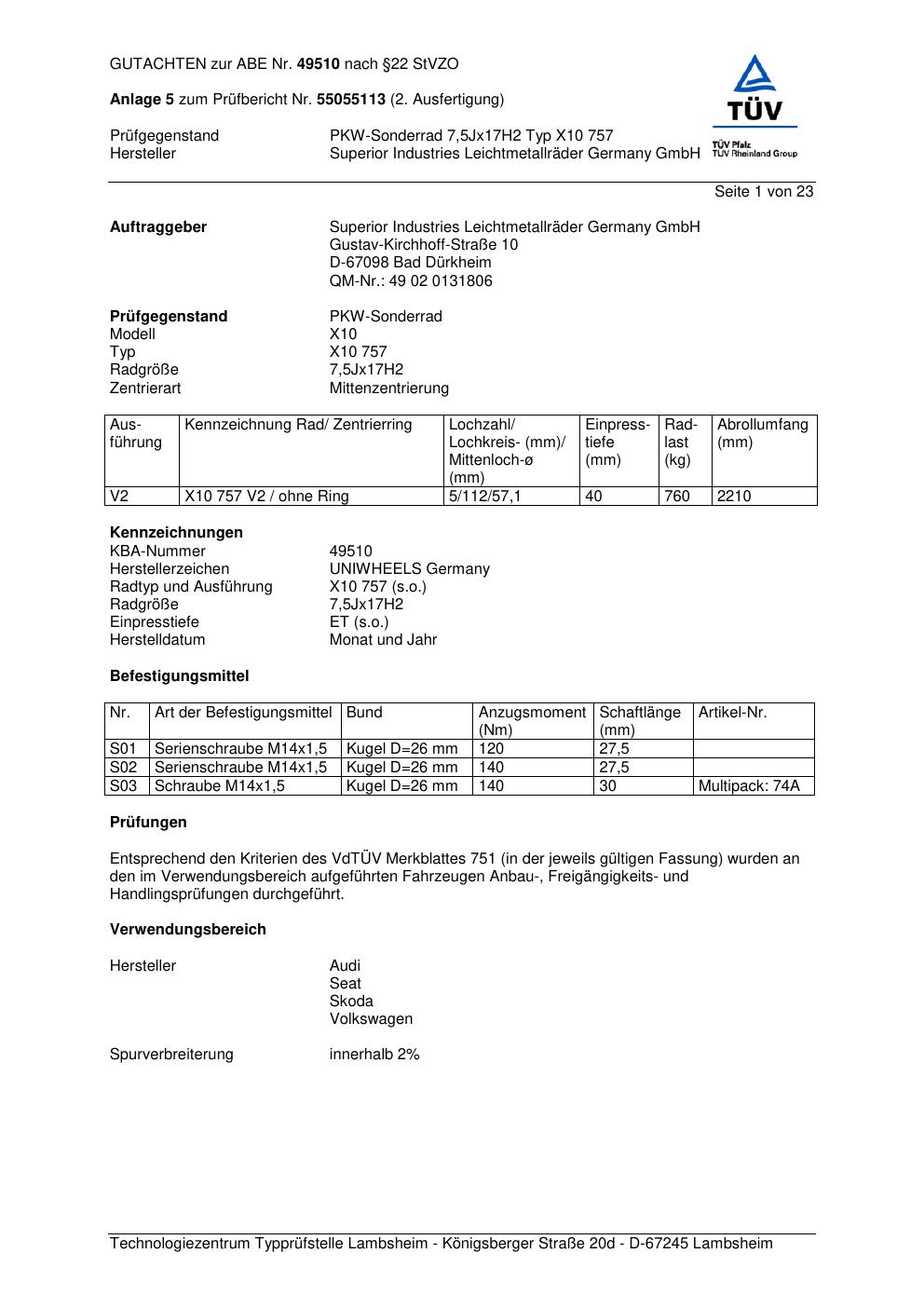 Dieses Gutachten (abe) bezieht sich auf die Alufelge Superior X10 757 in der Ausführung 7.5Jx17 ET 0, Mittenloch 0 mm (KBA 49510). Im PDF findest du typischerweise zulässige Reifengrößen, Auflagen/Anbauhinweise und – je nach Dokument – Hinweise zur Eintragung.