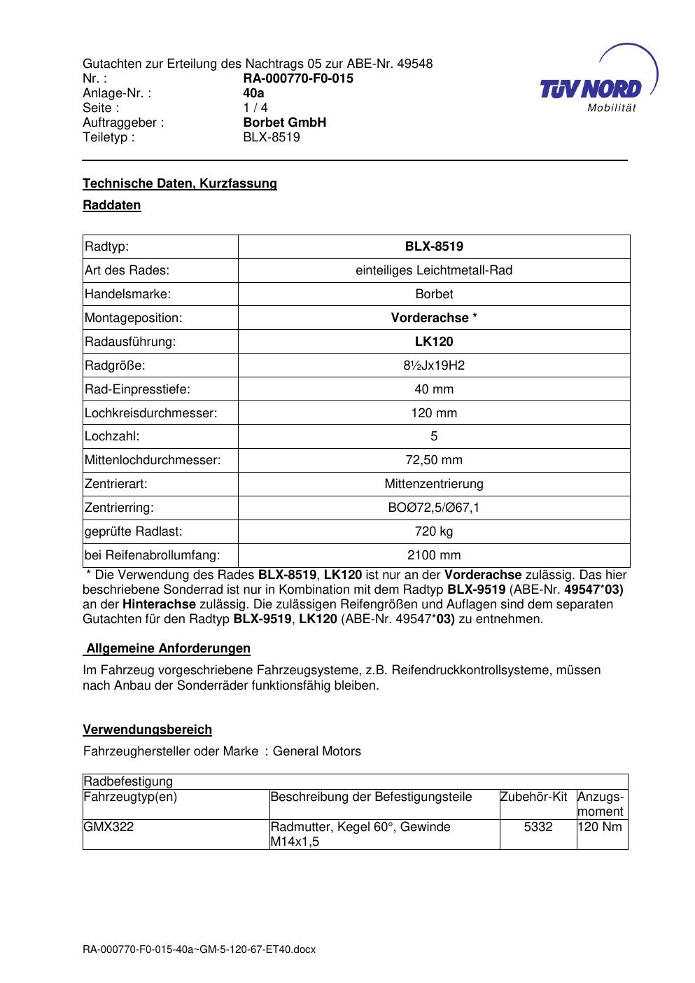 Dieses Gutachten (abe) bezieht sich auf die Alufelge brand-borbet BLX-8519 in der Ausführung 8.5Jx19 ET 0, Mittenloch 0 mm (KBA 49548). Im PDF findest du typischerweise zulässige Reifengrößen, Auflagen/Anbauhinweise und – je nach Dokument – Hinweise zur Eintragung.