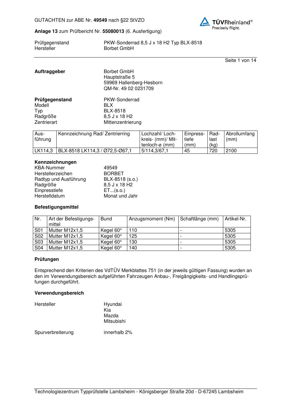 Dieses Gutachten (abe) bezieht sich auf die Alufelge Borbet BLX- 8518 in der Ausführung 8.5Jx18 ET 0, Mittenloch 0 mm (KBA 49549). Im PDF findest du typischerweise zulässige Reifengrößen, Auflagen/Anbauhinweise und – je nach Dokument – Hinweise zur Eintragung.