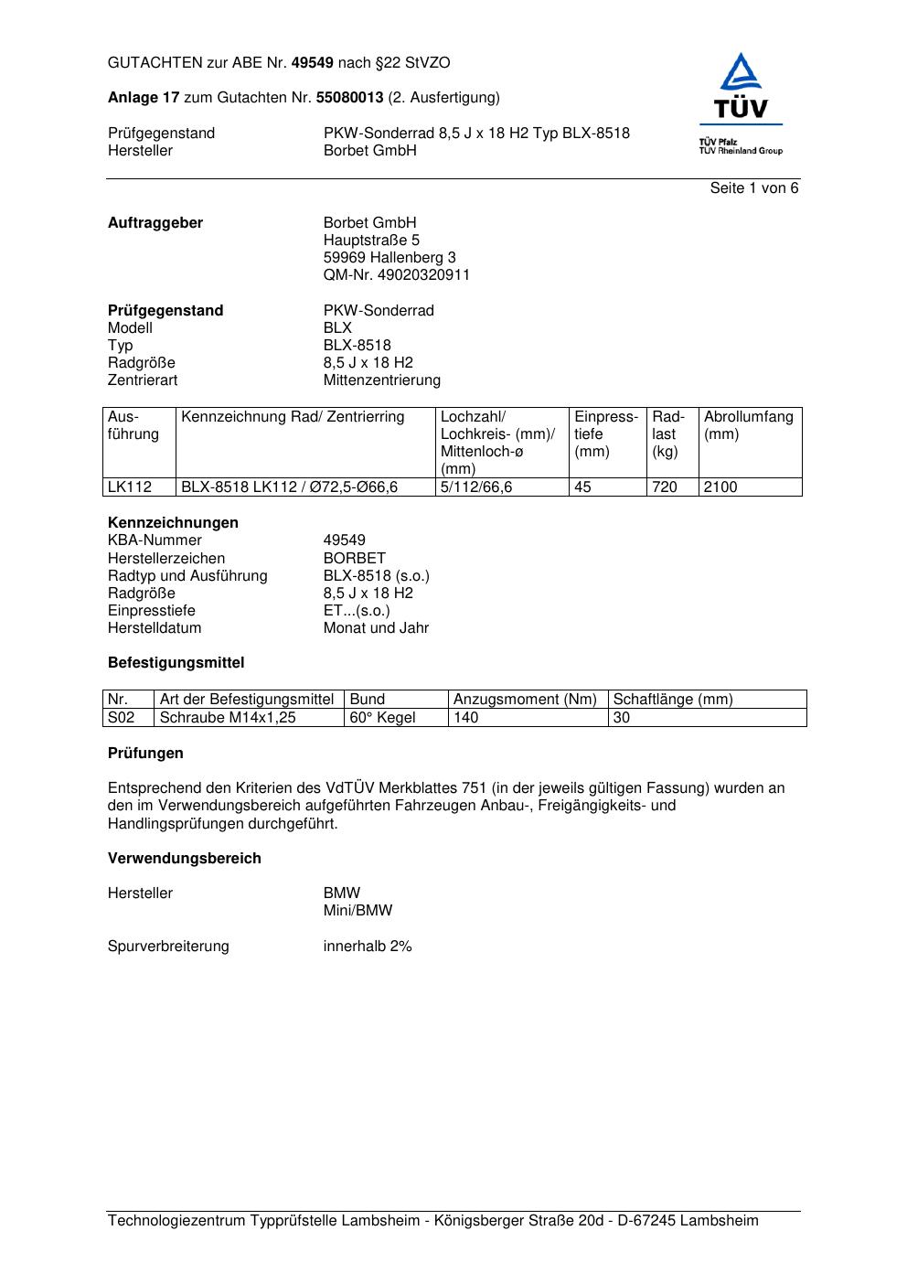 Dieses Gutachten (abe) bezieht sich auf die Alufelge Borbet BLX- 8518 in der Ausführung 8.5Jx18 ET 0, Mittenloch 0 mm (KBA 49549). Im PDF findest du typischerweise zulässige Reifengrößen, Auflagen/Anbauhinweise und – je nach Dokument – Hinweise zur Eintragung.