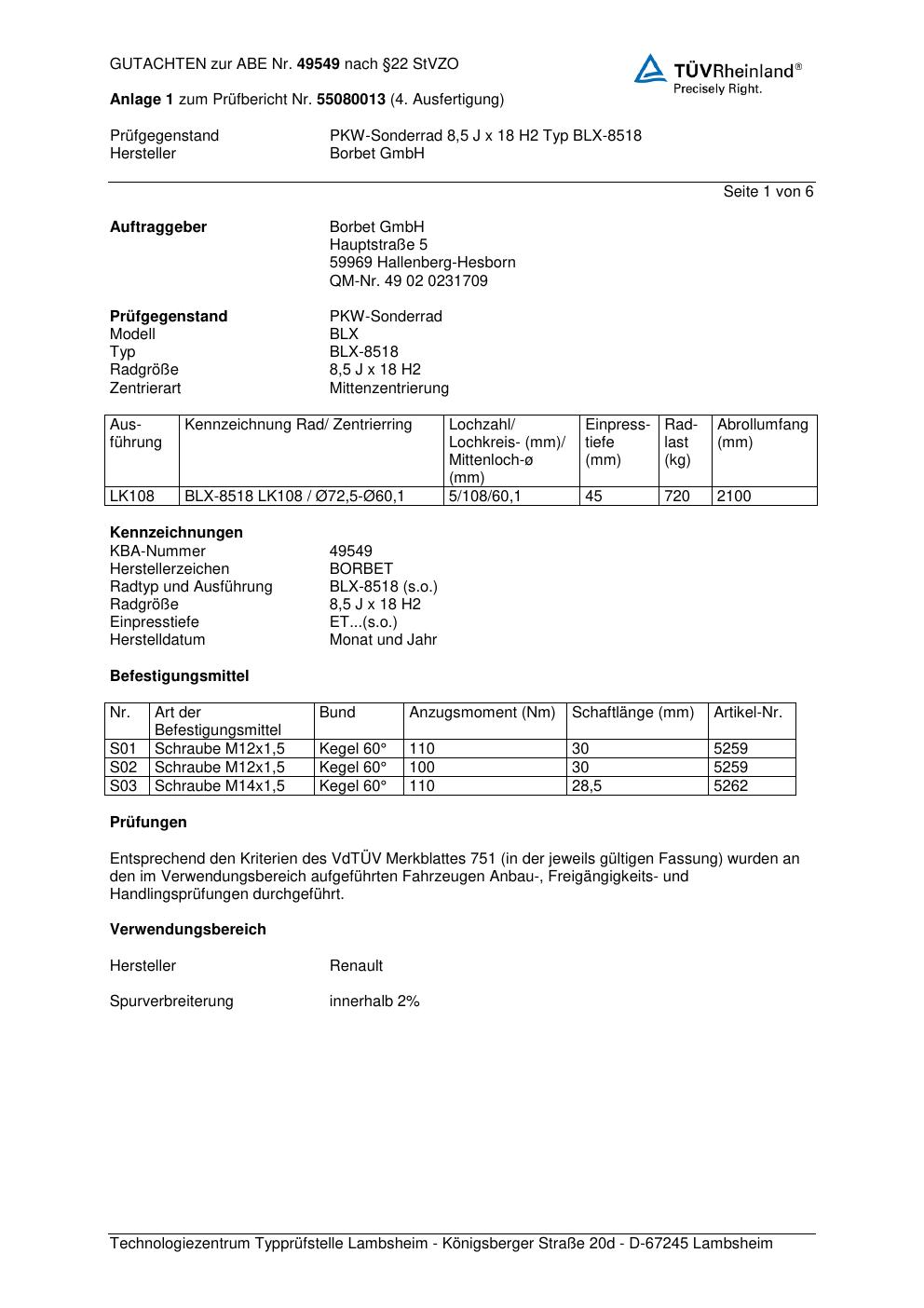 Dieses Gutachten (abe) bezieht sich auf die Alufelge Borbet BLX- 8518 in der Ausführung 8.5Jx18 ET 0, Mittenloch 0 mm (KBA 49549). Im PDF findest du typischerweise zulässige Reifengrößen, Auflagen/Anbauhinweise und – je nach Dokument – Hinweise zur Eintragung.