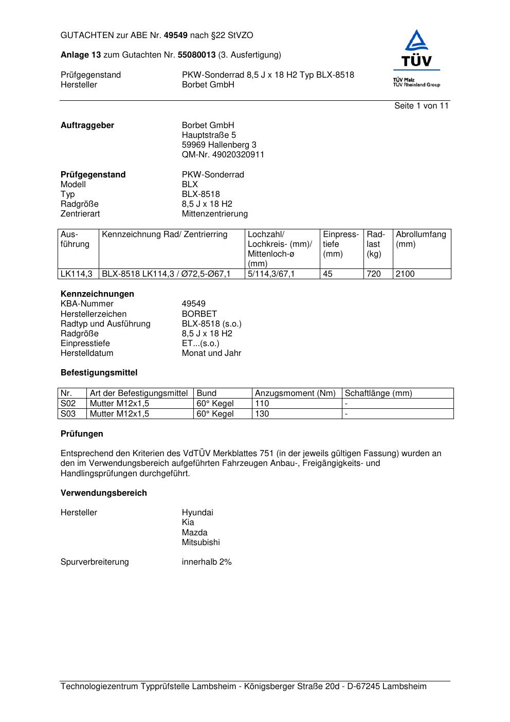 Dieses Gutachten (abe) bezieht sich auf die Alufelge Borbet BLX- 8518 in der Ausführung 8.5Jx18 ET 0, Mittenloch 0 mm (KBA 49549). Im PDF findest du typischerweise zulässige Reifengrößen, Auflagen/Anbauhinweise und – je nach Dokument – Hinweise zur Eintragung.