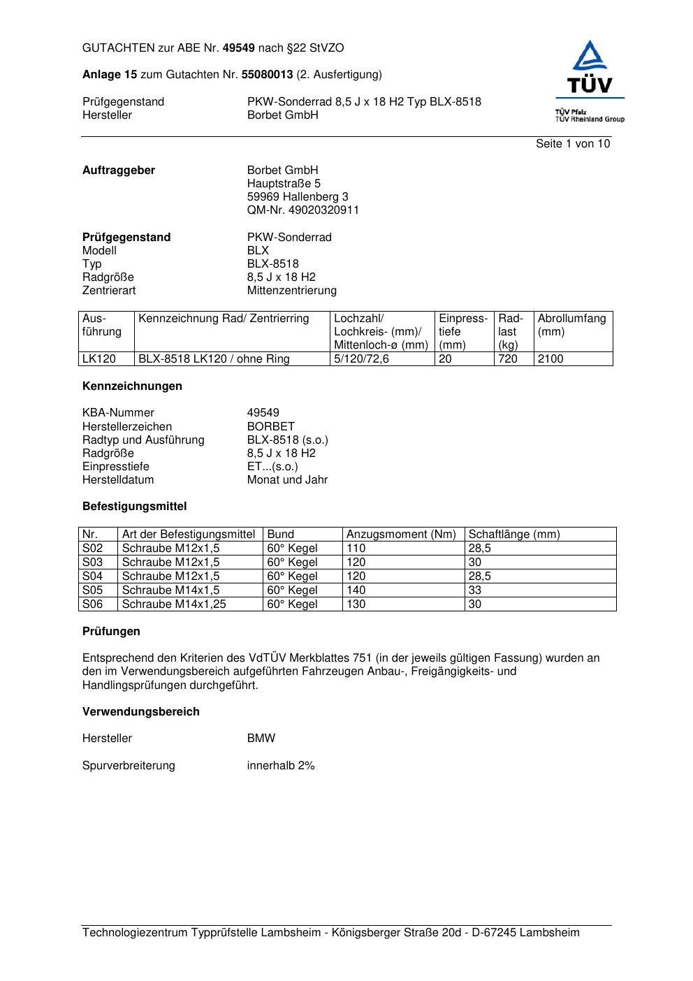 Dieses Gutachten (abe) bezieht sich auf die Alufelge Borbet BLX- 8518 in der Ausführung 8.5Jx18 ET 0, Mittenloch 0 mm (KBA 49549). Im PDF findest du typischerweise zulässige Reifengrößen, Auflagen/Anbauhinweise und – je nach Dokument – Hinweise zur Eintragung.