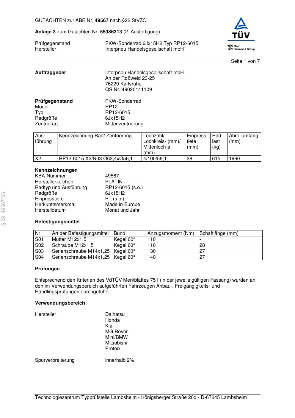 • Stimmt die KBA-Nummer auf der Felge mit diesem Dokument überein?
