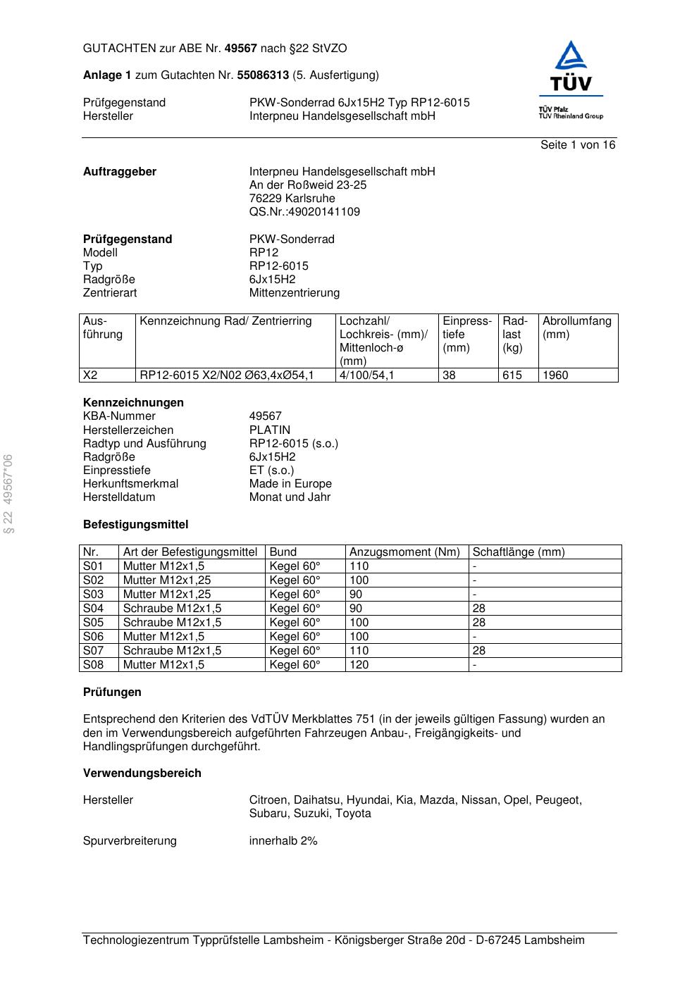 • Stimmt die KBA-Nummer auf der Felge mit diesem Dokument überein?