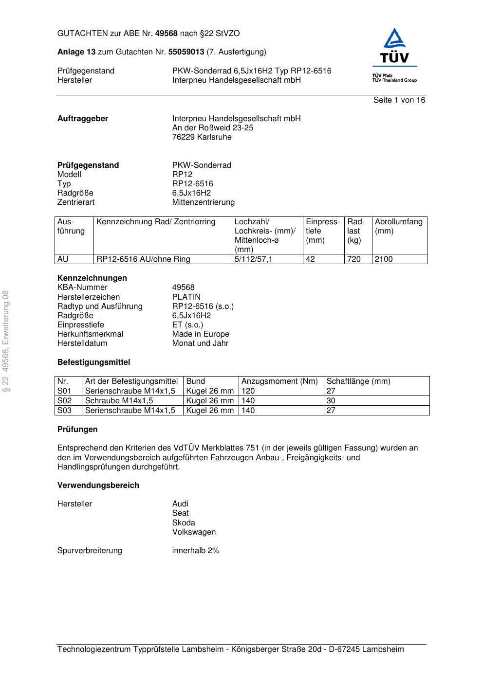 • Stimmt die KBA-Nummer auf der Felge mit diesem Dokument überein?