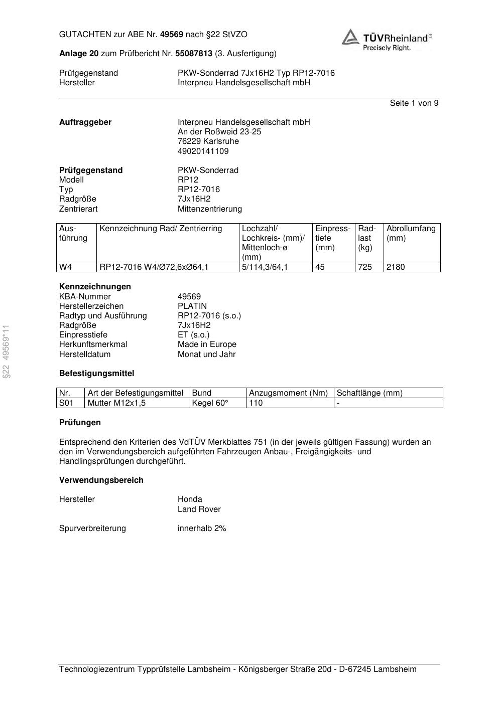 • Stimmt die KBA-Nummer auf der Felge mit diesem Dokument überein?