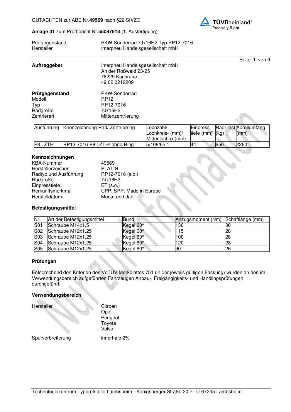 • Stimmt die KBA-Nummer auf der Felge mit diesem Dokument überein?