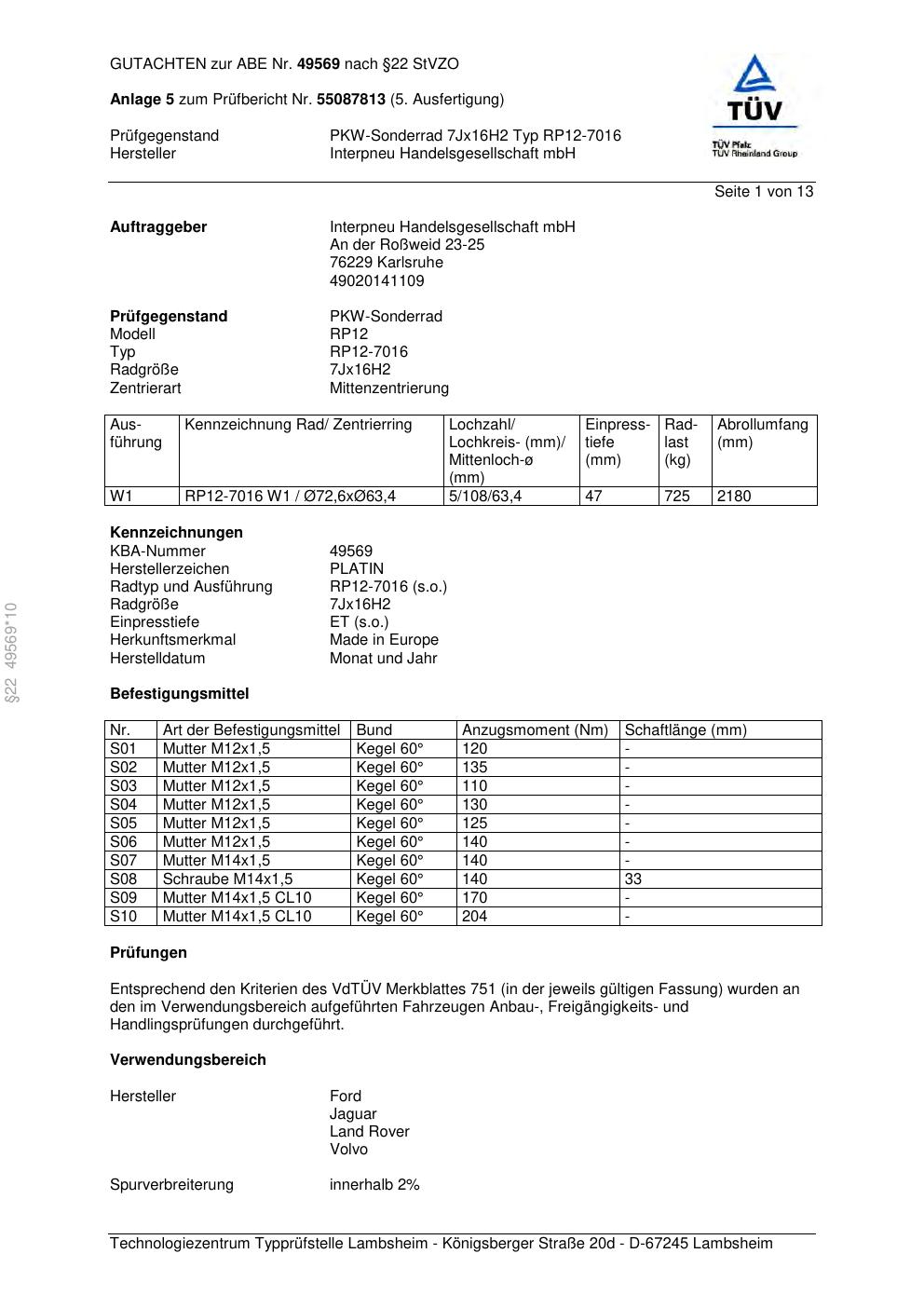 • Stimmt die KBA-Nummer auf der Felge mit diesem Dokument überein?