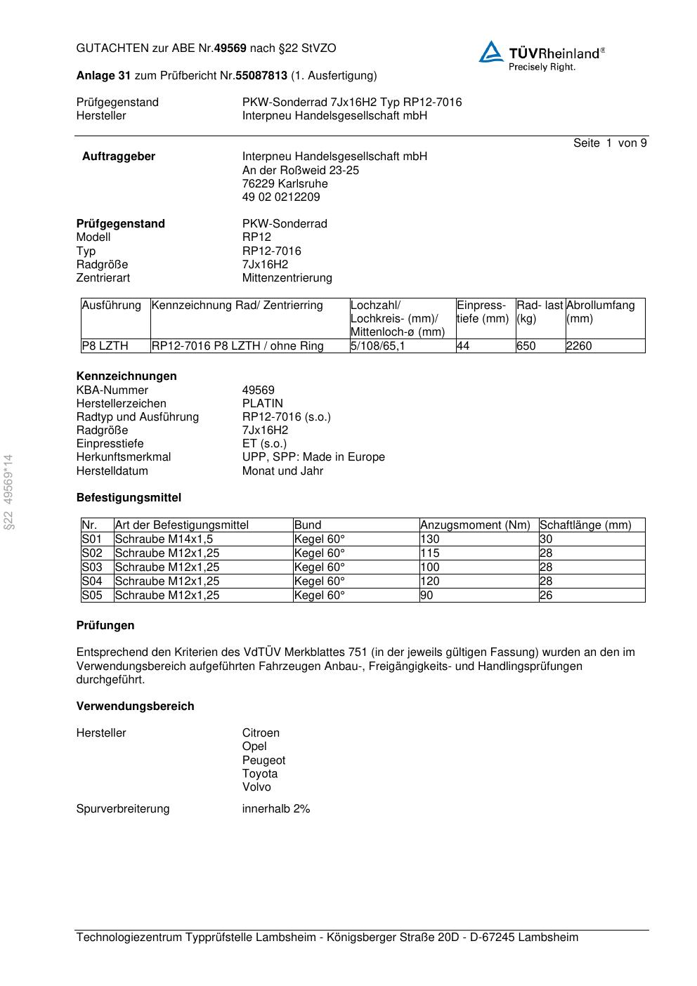 • Stimmt die KBA-Nummer auf der Felge mit diesem Dokument überein?