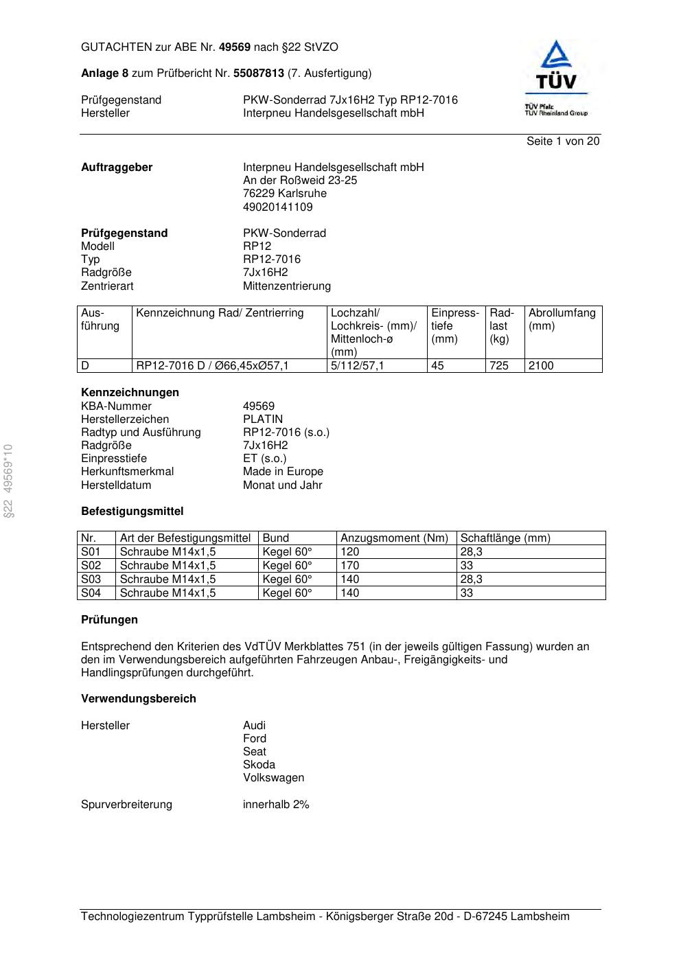 Dieses abe gehört zur Felge Platin RP12-7016 in 7Jx16 ET0 mit KBA 49569. Die Seite ist dafür gedacht, dass du schnell prüfen kannst, ob KBA, Design und Größe zu deiner Felge passen und danach direkt das richtige PDF lädst.