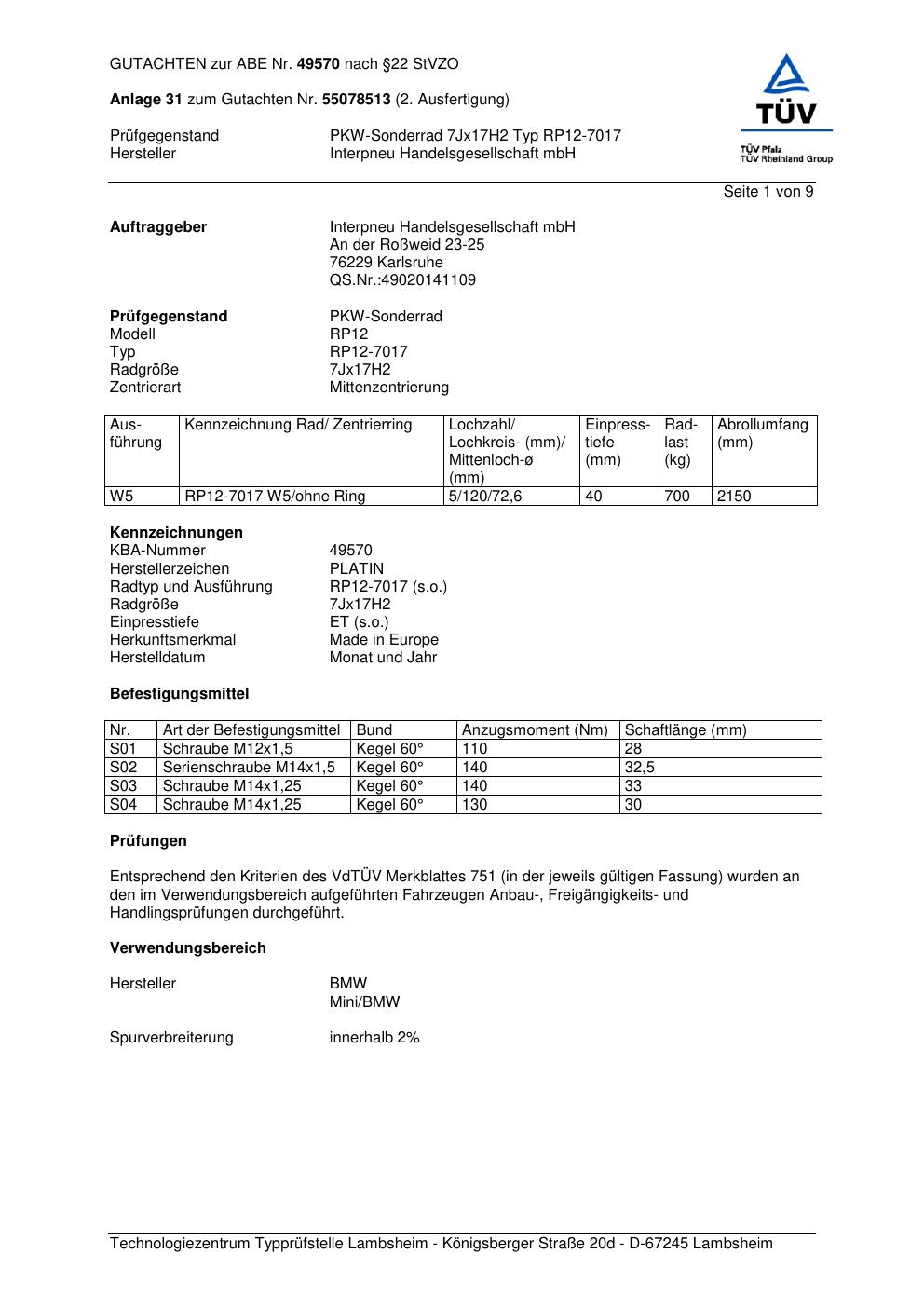 • Stimmt die KBA-Nummer auf der Felge mit diesem Dokument überein?