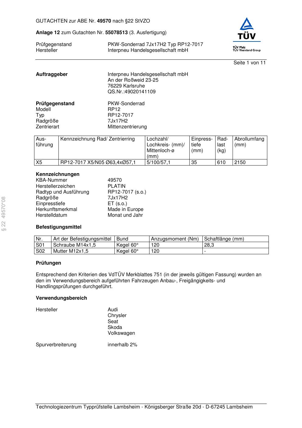 Dieses abe gehört zur Felge Platin RP12-7017 in 7Jx17 ET0 mit KBA 49570. Die Seite ist dafür gedacht, dass du schnell prüfen kannst, ob KBA, Design und Größe zu deiner Felge passen und danach direkt das richtige PDF lädst.