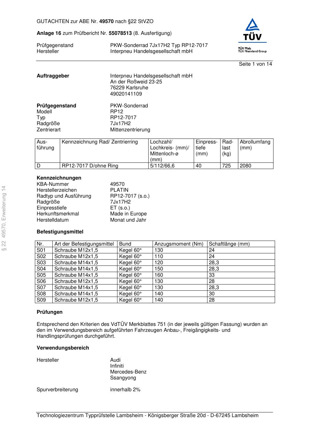 Dieses abe gehört zur Felge Platin RP12-7017 in 7Jx17 ET0 mit KBA 49570. Die Seite ist dafür gedacht, dass du schnell prüfen kannst, ob KBA, Design und Größe zu deiner Felge passen und danach direkt das richtige PDF lädst.