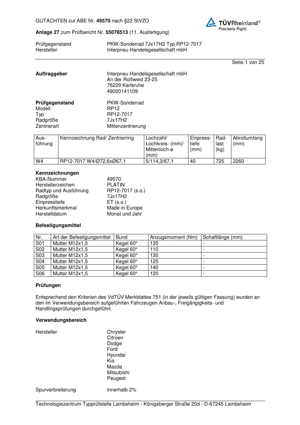 Dieses abe gehört zur Felge Platin RP12-7017 in 7Jx17 ET0 mit KBA 49570. Die Seite ist dafür gedacht, dass du schnell prüfen kannst, ob KBA, Design und Größe zu deiner Felge passen und danach direkt das richtige PDF lädst.
