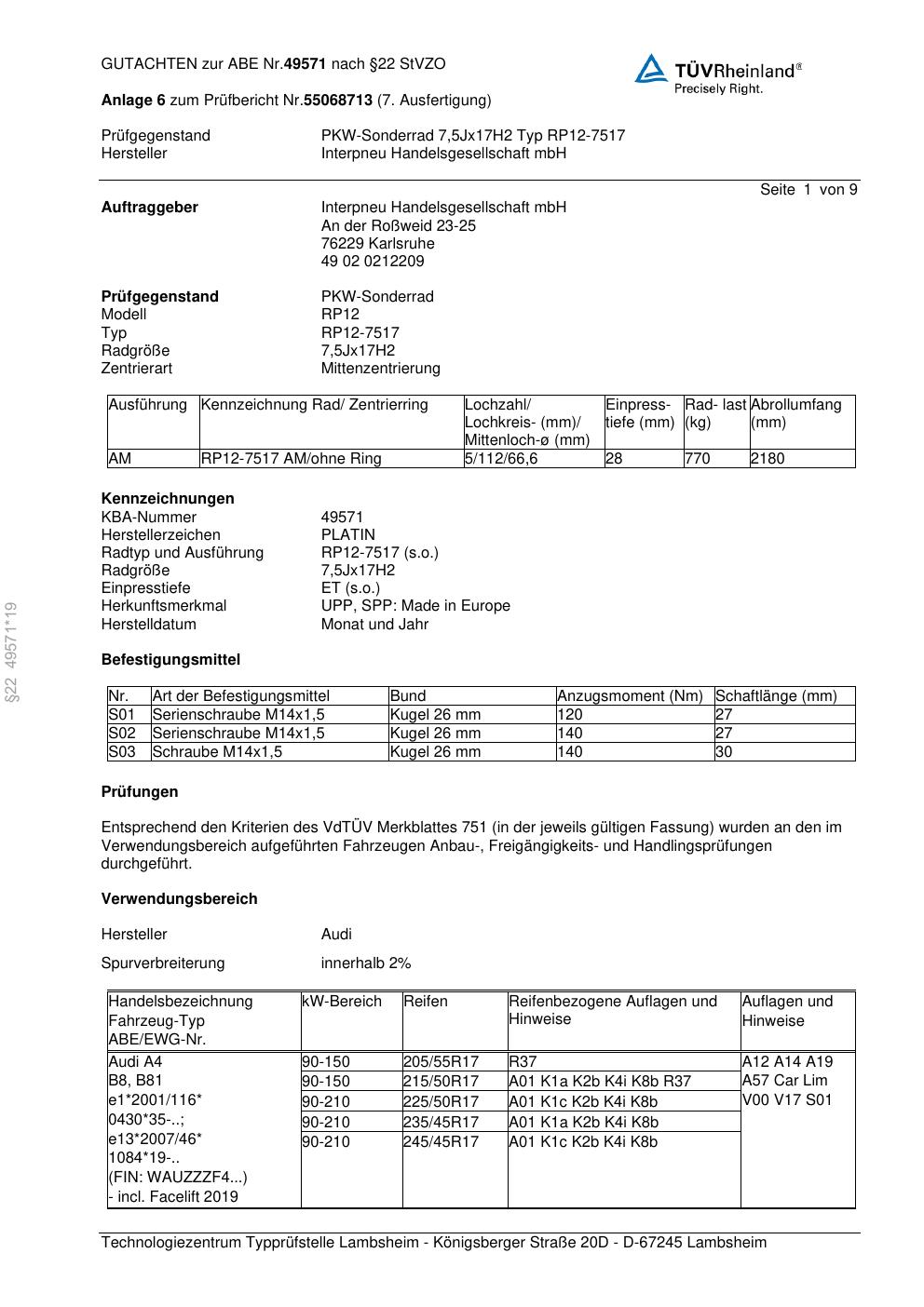 • Stimmt die KBA-Nummer auf der Felge mit diesem Dokument überein?