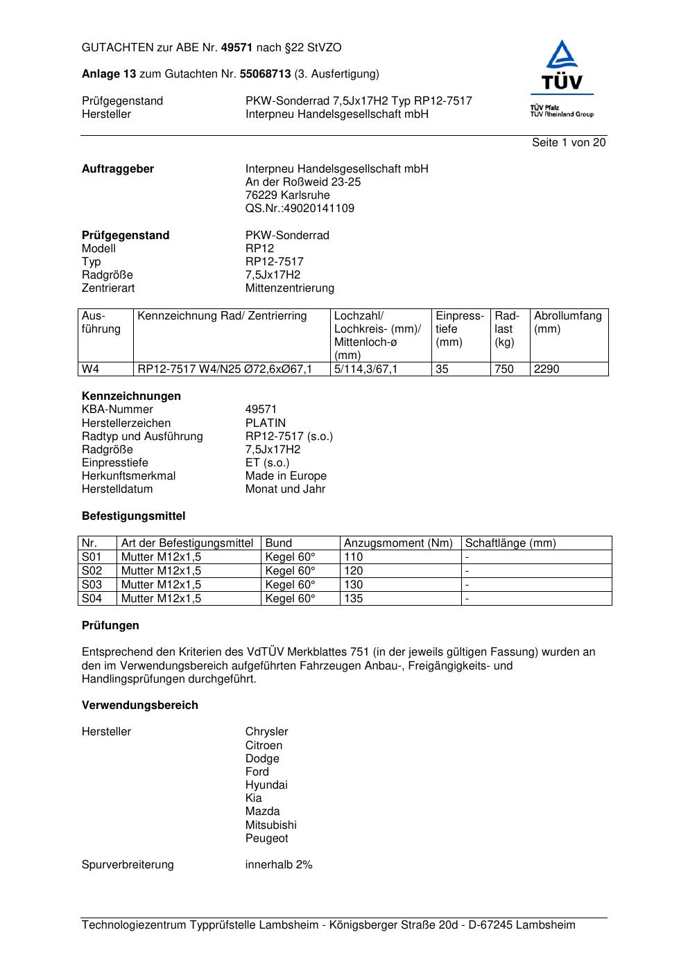 Dieses abe gehört zur Felge Platin RP12-751 7 in 7.5Jx17 ET0 mit KBA 49571. Die Seite ist dafür gedacht, dass du schnell prüfen kannst, ob KBA, Design und Größe zu deiner Felge passen und danach direkt das richtige PDF lädst.