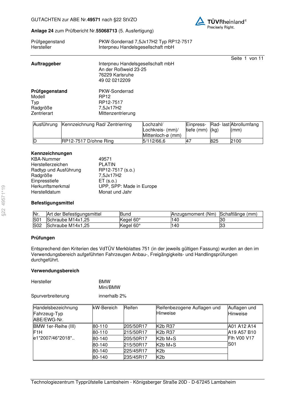 • Stimmt die KBA-Nummer auf der Felge mit diesem Dokument überein?