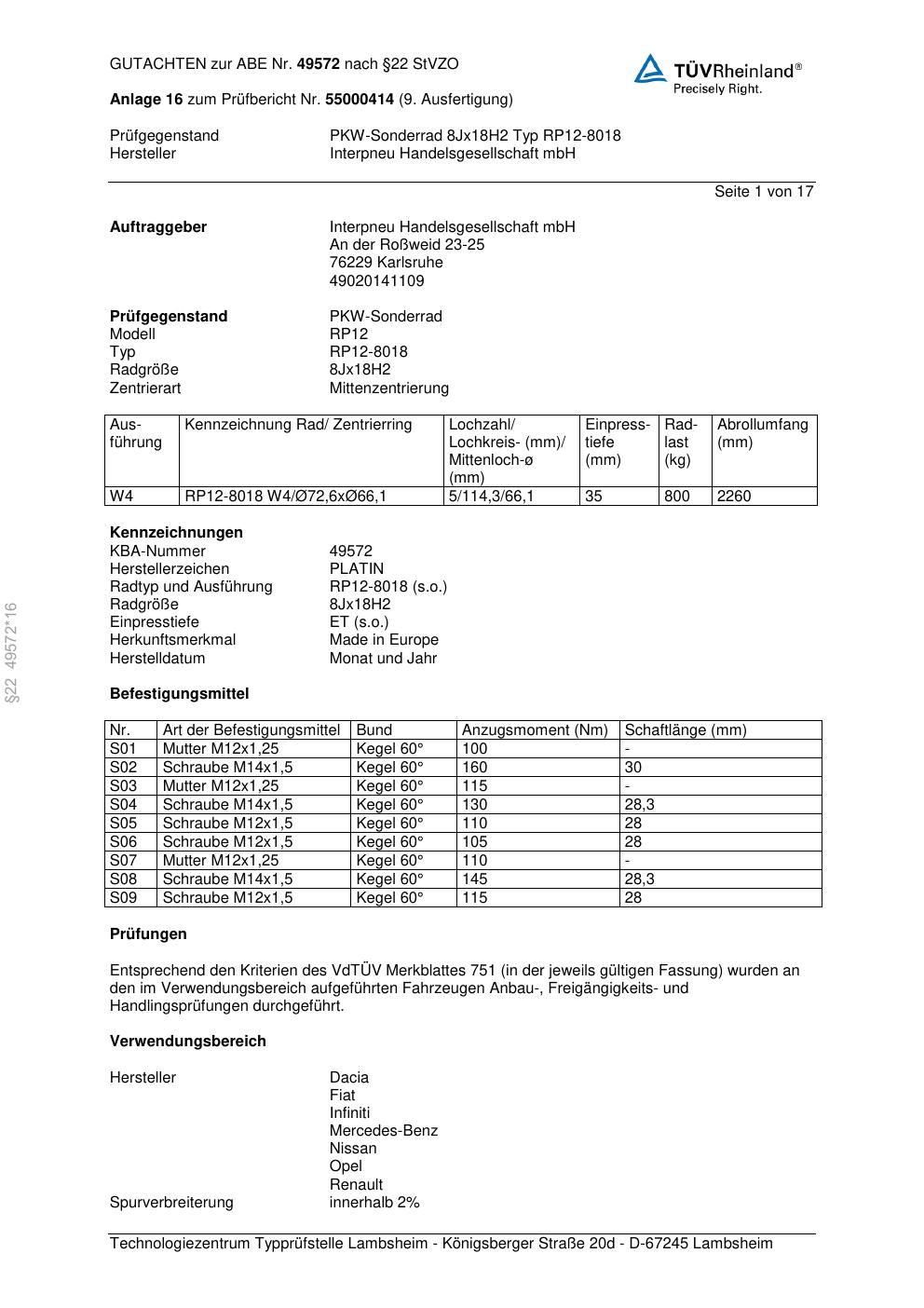• Stimmt die KBA-Nummer auf der Felge mit diesem Dokument überein?