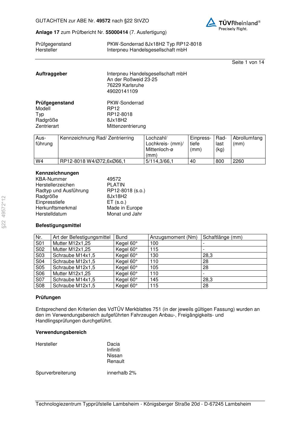 • Stimmt die KBA-Nummer auf der Felge mit diesem Dokument überein?