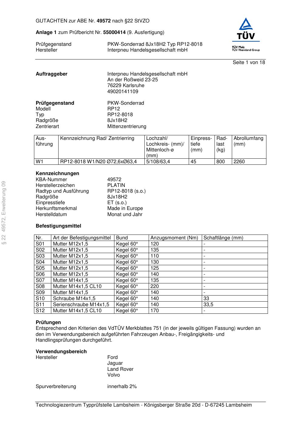 • Stimmt die KBA-Nummer auf der Felge mit diesem Dokument überein?