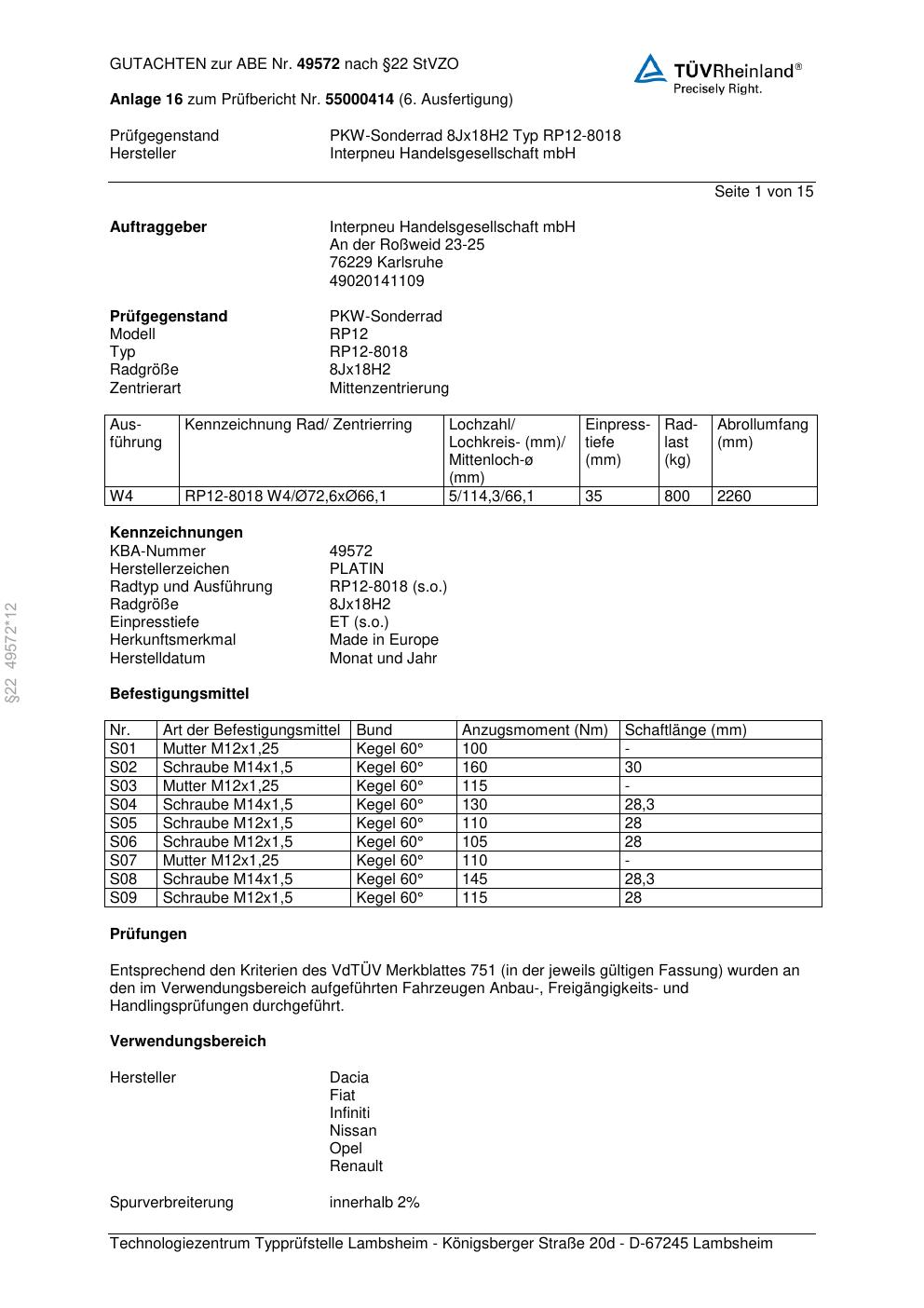 • Stimmt die KBA-Nummer auf der Felge mit diesem Dokument überein?