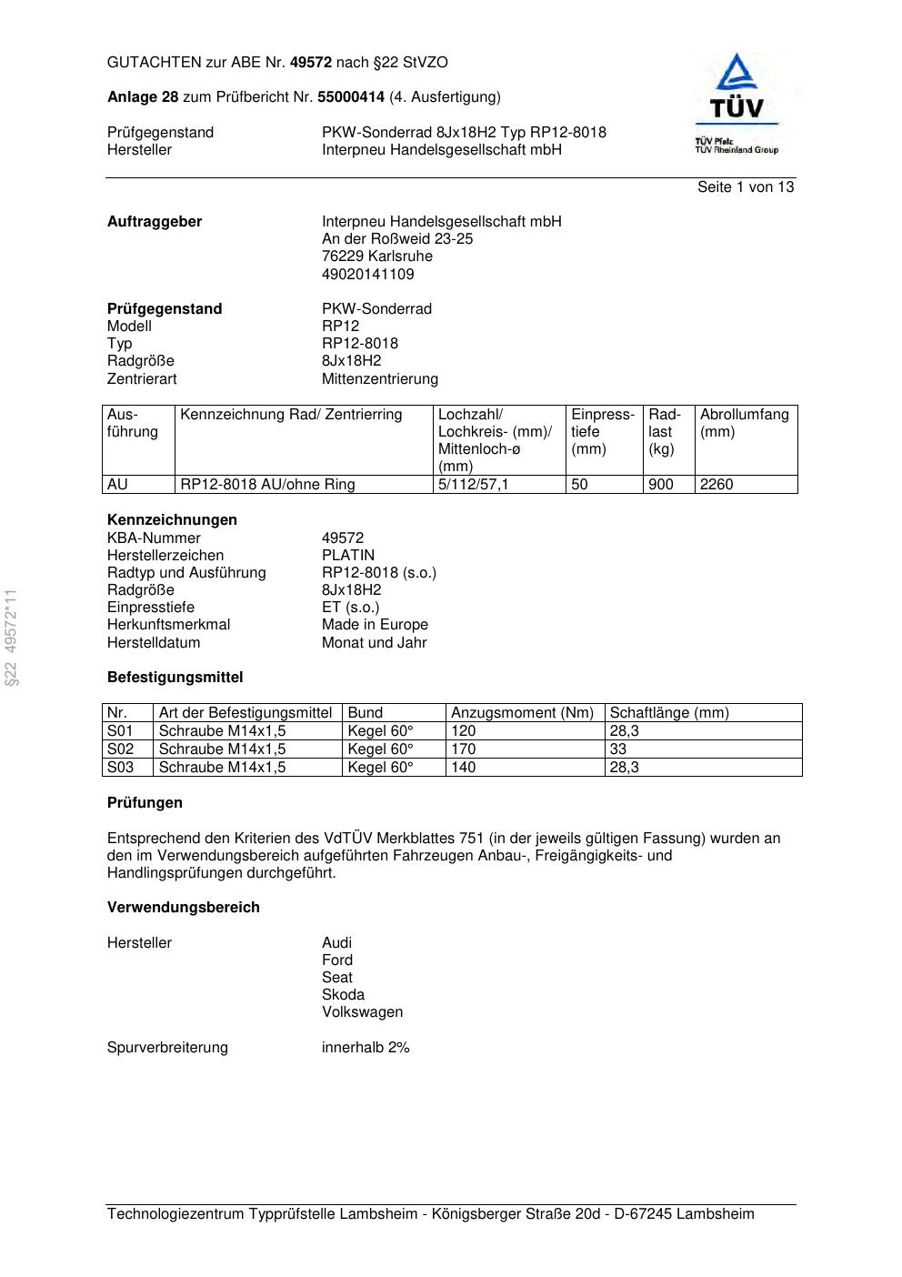 • Stimmt die KBA-Nummer auf der Felge mit diesem Dokument überein?