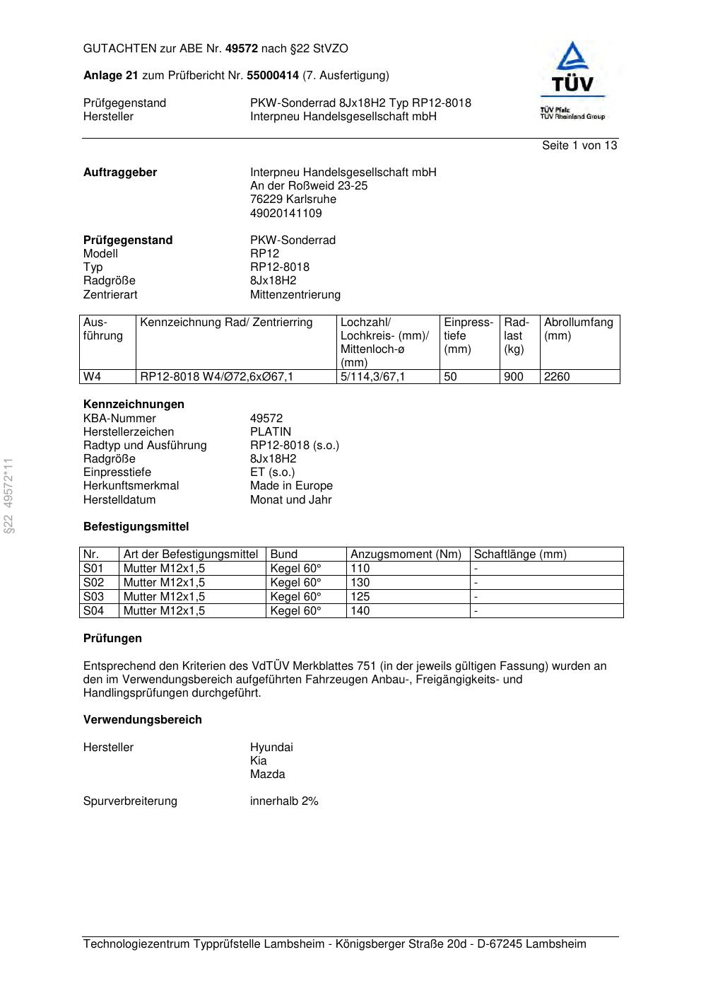 • Stimmt die KBA-Nummer auf der Felge mit diesem Dokument überein?