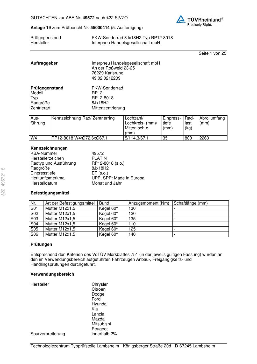 Dieses abe gehört zur Felge Platin RP12-8018 in 8Jx18 ET0 mit KBA 49572. Die Seite ist dafür gedacht, dass du schnell prüfen kannst, ob KBA, Design und Größe zu deiner Felge passen und danach direkt das richtige PDF lädst.