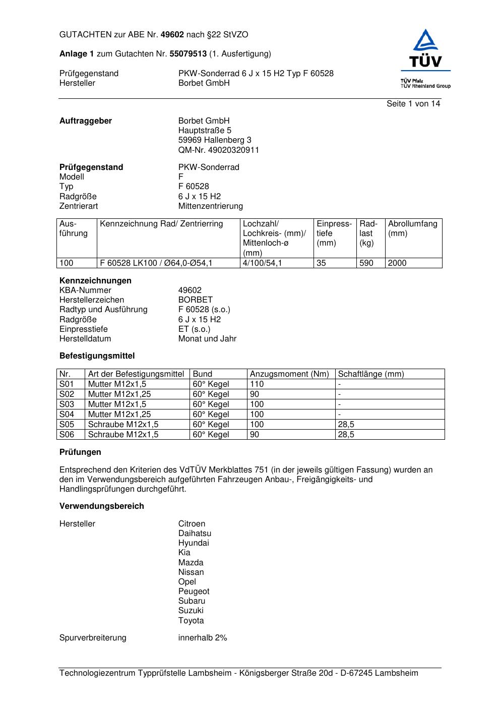 Dieses Gutachten (abe) bezieht sich auf die Alufelge Borbet F 6052 8 in der Ausführung 6Jx15 ET 0, Mittenloch 0 mm (KBA 49602). Im PDF findest du typischerweise zulässige Reifengrößen, Auflagen/Anbauhinweise und – je nach Dokument – Hinweise zur Eintragung.