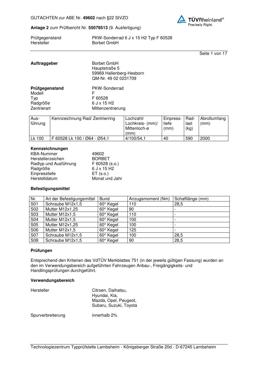 Dieses Gutachten (abe) bezieht sich auf die Alufelge Borbet F 6052 8 in der Ausführung 6Jx15 ET 0, Mittenloch 0 mm (KBA 49602). Im PDF findest du typischerweise zulässige Reifengrößen, Auflagen/Anbauhinweise und – je nach Dokument – Hinweise zur Eintragung.