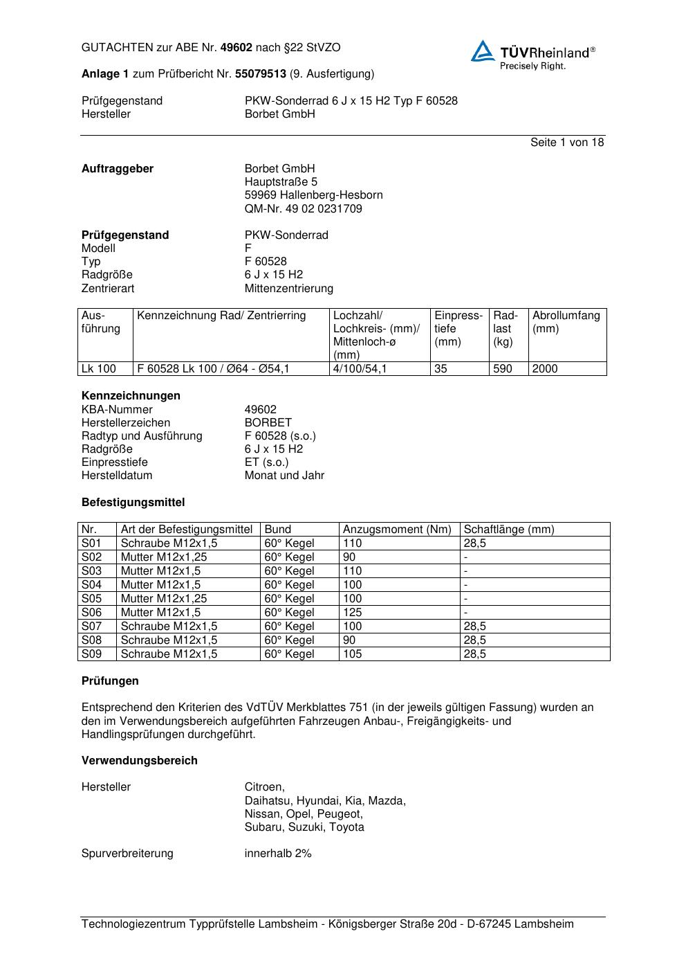 Dieses Gutachten (abe) bezieht sich auf die Alufelge Borbet F 6052 8 in der Ausführung 6Jx15 ET 0, Mittenloch 0 mm (KBA 49602). Im PDF findest du typischerweise zulässige Reifengrößen, Auflagen/Anbauhinweise und – je nach Dokument – Hinweise zur Eintragung.