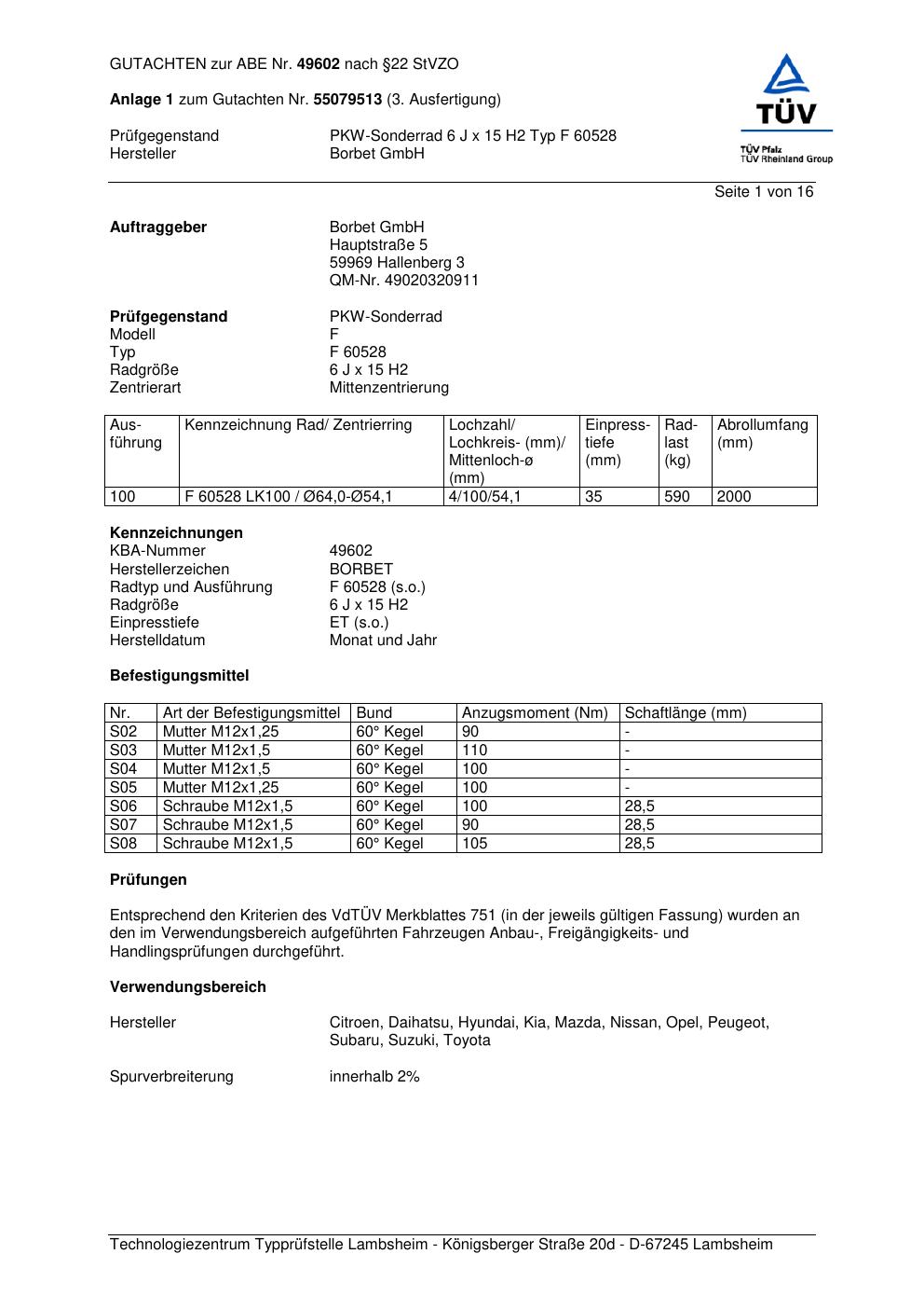 Dieses Gutachten (abe) bezieht sich auf die Alufelge Borbet F 6052 8 in der Ausführung 6Jx15 ET 0, Mittenloch 0 mm (KBA 49602). Im PDF findest du typischerweise zulässige Reifengrößen, Auflagen/Anbauhinweise und – je nach Dokument – Hinweise zur Eintragung.