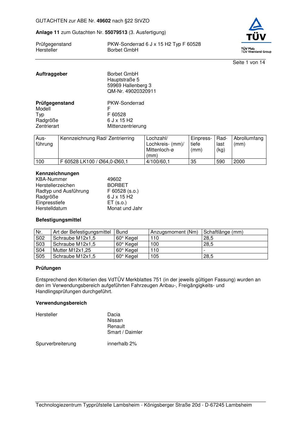 Dieses Gutachten (abe) bezieht sich auf die Alufelge Borbet F 6052 8 in der Ausführung 6Jx15 ET 0, Mittenloch 0 mm (KBA 49602). Im PDF findest du typischerweise zulässige Reifengrößen, Auflagen/Anbauhinweise und – je nach Dokument – Hinweise zur Eintragung.