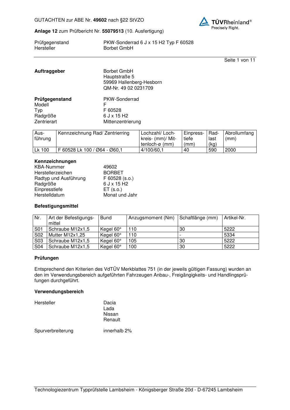 Dieses Gutachten (abe) bezieht sich auf die Alufelge Borbet F 6052 8 in der Ausführung 6Jx15 ET 0, Mittenloch 0 mm (KBA 49602). Im PDF findest du typischerweise zulässige Reifengrößen, Auflagen/Anbauhinweise und – je nach Dokument – Hinweise zur Eintragung.