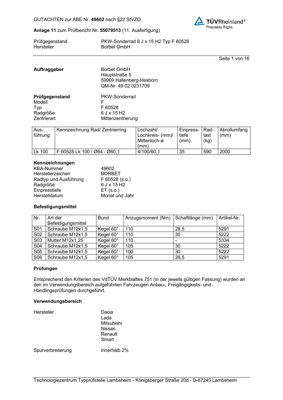 Dieses Gutachten (abe) bezieht sich auf die Alufelge Borbet F 60528 in der Ausführung 6Jx15 ET 0, Mittenloch 0 mm (KBA 49602). Im PDF findest du typischerweise zulässige Reifengrößen, Auflagen/Anbauhinweise und – je nach Dokument – Hinweise zur Eintragung.