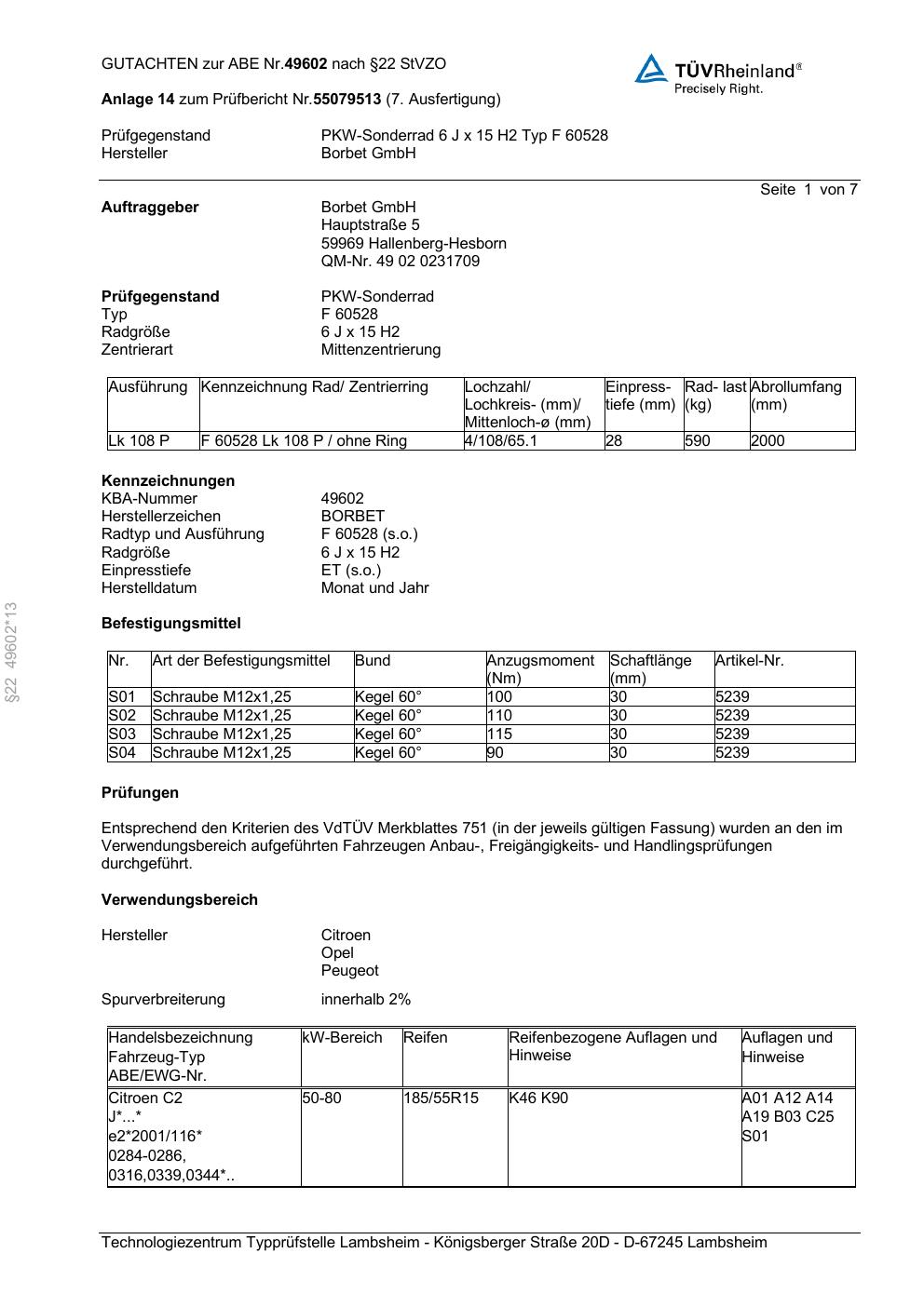 Dieses Gutachten (abe) bezieht sich auf die Alufelge Borbet F 60528 in der Ausführung 6Jx15 ET 0, Mittenloch 0 mm (KBA 49602). Im PDF findest du typischerweise zulässige Reifengrößen, Auflagen/Anbauhinweise und – je nach Dokument – Hinweise zur Eintragung.