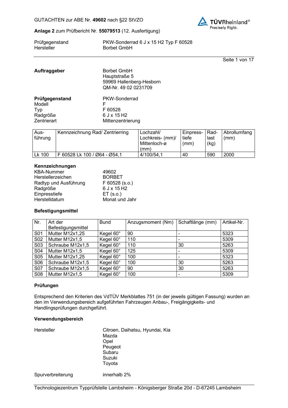Dieses Gutachten (abe) bezieht sich auf die Alufelge Borbet F 60528 in der Ausführung 6Jx15 ET 0, Mittenloch 0 mm (KBA 49602). Im PDF findest du typischerweise zulässige Reifengrößen, Auflagen/Anbauhinweise und – je nach Dokument – Hinweise zur Eintragung.