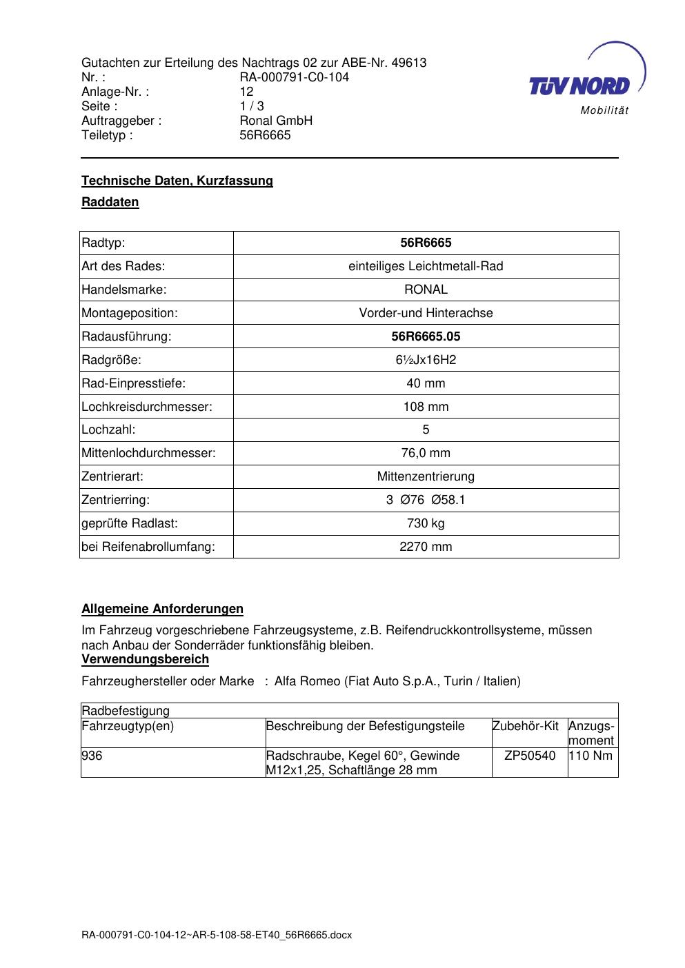 Dieses Gutachten (abe) bezieht sich auf die Alufelge Ronal 56R6665 in der Ausführung ET 0, Mittenloch 0 mm (KBA 49613). Im PDF findest du typischerweise zulässige Reifengrößen, Auflagen/Anbauhinweise und – je nach Dokument – Hinweise zur Eintragung.